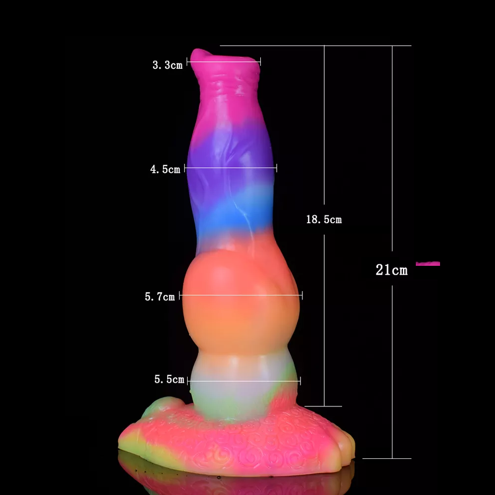 The Fenrir Dildo is a dildo coloured in Radiant Sunset, a vibrant gradient that glows in the dark. This wolf inspired dildo features a flat head and an enlarged knot near the base, ensuring that it gets locked firmly in place while inside of you. This dildo is perfect for those who want to experience a different and exciting way of being pleasured.
