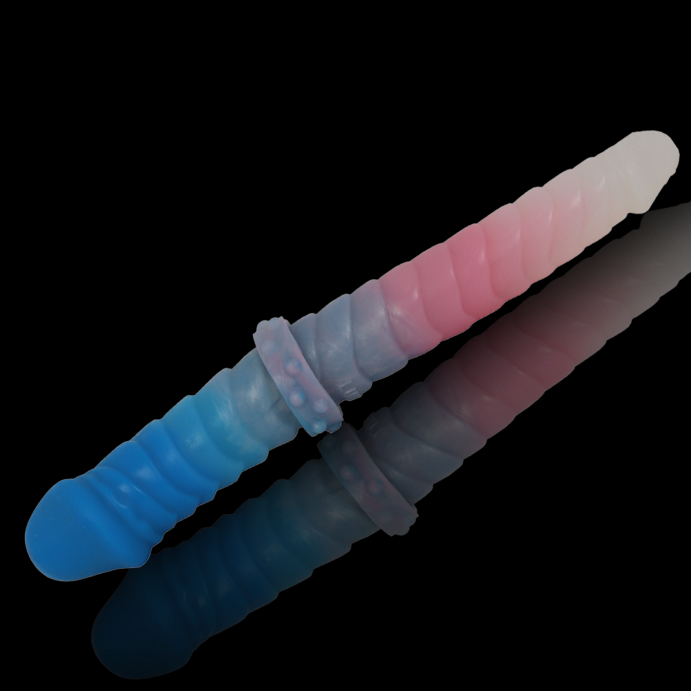 The Scaled Duo Dildo is a double ended dildo coloured in Faerie Floss, a cotton candy gradient. Both ends feature scaled ribbing to enhance pleasure, one of them being longer and thinner while the other end is shorter and thicker. This dildo is perfect for someone who wants a dildo that can satisfy them in more than one way, or for playing with a partner.