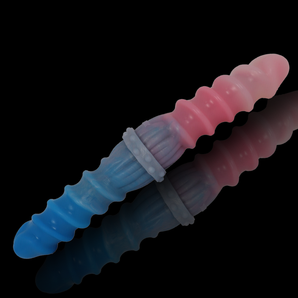The Spiral Duo Dildo is a double ended dildo coloured in Faerie Floss, a cotton candy gradient. Both ends feature a dildo with spiral ribbing to enhance pleasure. This dildo is perfect for someone who wants a dildo that can satisfy them in more than one way, or for playing with a partner.